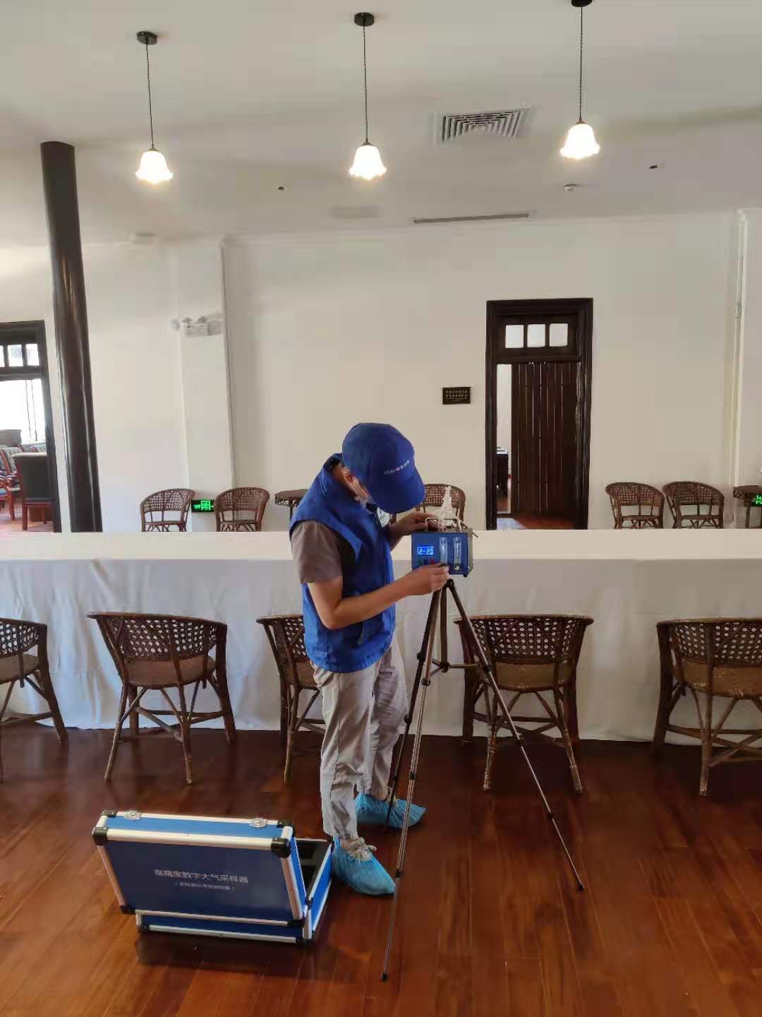 打開大氣采樣儀開關(guān) ,將時(shí)間調(diào)至20分鐘,穿上鞋套,將儀器帶入客戶家中,并放上溫濕計(jì)。